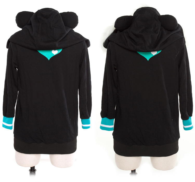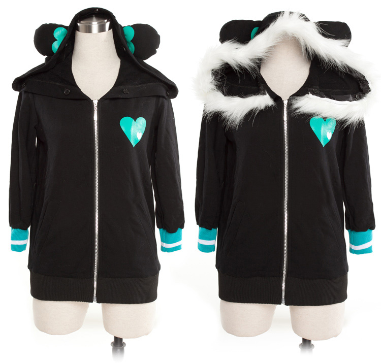 スポーツウェアなタイプです。裏地もついたしっかりしたつくりです。後ろ側は大きなハートを付けで、胸先は同色なハートある、帽子の縁は白いふわふわと耳も同じです。